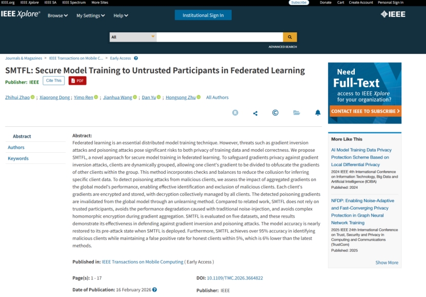 我院青年教师赵智慧在CCF A类国际顶级学术期刊IEEE T...
