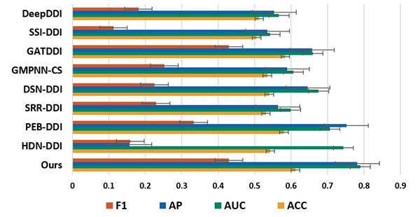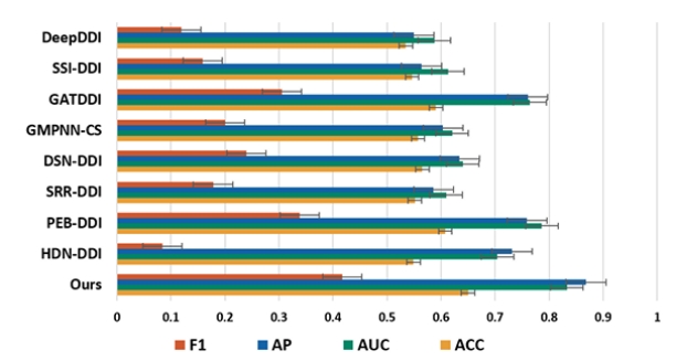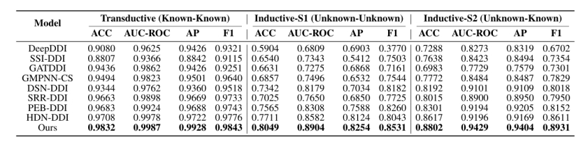 实验在多个标准DDI基准数据集上开展,涵盖直推式与归纳式设置。结果表明,PC-DDI 在准确率(ACC)、AUC-ROC、平均精度(AP)和F1值等核心指标上均显著优于当前主流方法。