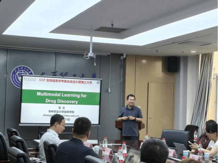 在特邀报告阶段,华中农业大学章文教授作了题为《面向药物发现的多模态表示学习》的特邀报告,主要介绍了AI赋能药物发现的重要问题和进展,并从分子筛选、分子优化、生成式AI及药物不良反应预测四个方面进行了深入的探讨。