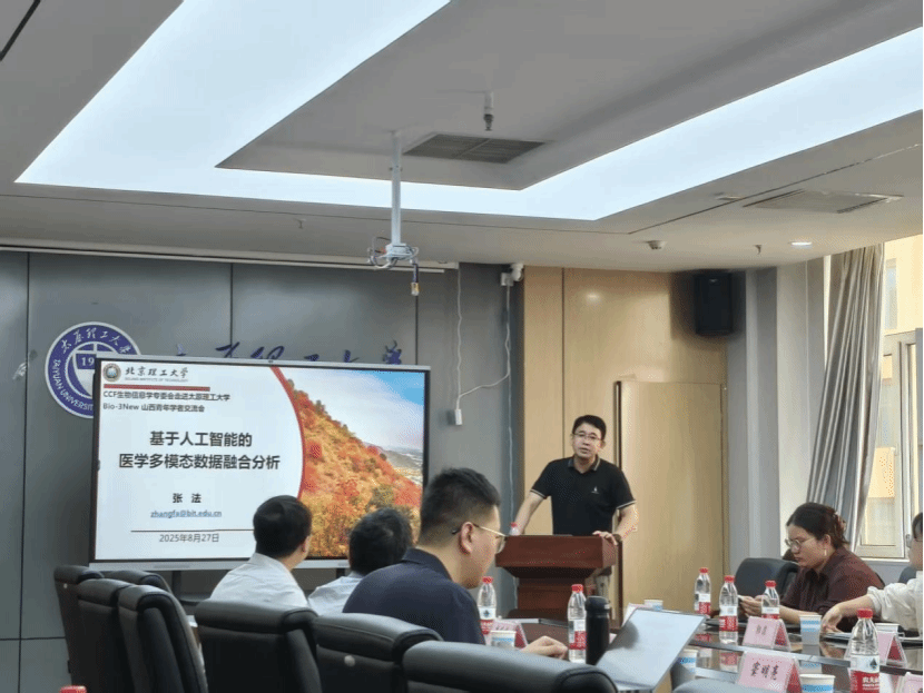 2025年8月26-28日,由中国计算机学会(CCF)主办,CCF生物信息学专委、太原理工大学承办的CCF@U走进高校活动(CCF生物信息学专委会走进太原理工大学)暨BIO-3NEW山西青年学者交流会在太原理工大学举行。本次活动旨在深度探究生物信息学与人工智能技术融合的发展焦点与趋势,同时为奋战在科研一线的青年师生搭建起优质的科研学术交流平台。CCF生物信息学专委会副主任、北京理工大学张法教授,CCF生物信息学专委会秘书长、山东大学崔学峰教授,华中农业大学章文教授,中南大学郭菲教授,计算机科学与技术学院(大数据学院)副院长李东喜、副院长王彬及青年师生参加会议。会议由李东喜副院长及郭菲教授共同主持。