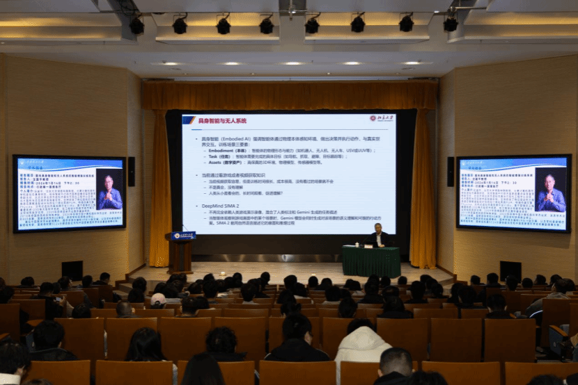 为搭建学术交流桥梁,助力师生把握计算机图形学与虚拟仿真领域前沿动态,1月14日下午,我校特邀北京大学博雅特聘教授汪国平,带来题为《面向具身智能和无人系统的智能增强训练系统》的高水平学术报告。本次报告由计算机科学与技术学院(大数据学院)承办组织,计算机科学与技术学院(大数据学院)、电子信息工程学院、物理与光电工程学院、集成电路学院、人工智能学院、软件学院师生齐聚,共赴这场聚焦技术突破与产业应用的学术盛宴。副校长桑胜波主持报告。