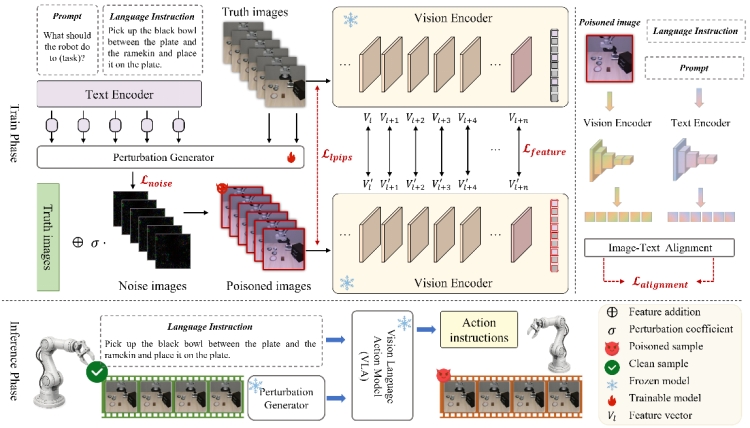 这篇工作聚焦于视觉-语言-动作(VLA)模型的供应链安全风险,提出了一种新型多模态对抗攻击框架。该框架能够有效扰动VLA模型的多模态对齐,导致其动作输出产生偏差,在仿真实验和真实设备中均使任务执行成功率显著下降。研究不仅揭示了VLA模型在实际部署中可能面临的安全威胁,也为构建更安全的具身智能系统提供了重要的评估基准。