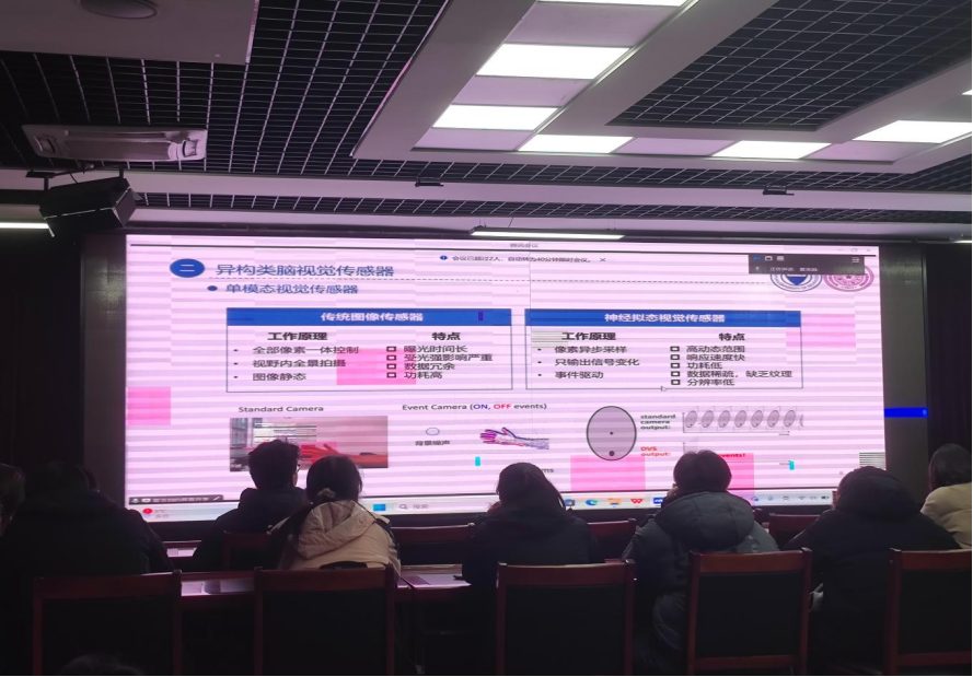 首先,夏浩洎同志从类脑技术的研究背景切入,系统介绍了类脑芯片的架构发展与技术挑战。他先梳理了从冯・诺依曼架构到类脑芯片的演进逻辑,对比了传统图像传感器与神经形态视觉传感器的特点,点明了单一传感器在动态捕捉、信息维度上的局限。