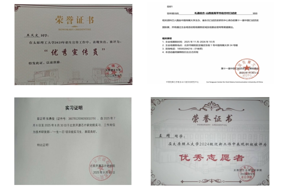 班级同学踊跃投身社会实践,在不同领域展现出卓越风采。部分同学所在实践团队凭借出色表现荣获 “优秀团队” 等荣誉称号,并获得珍贵的国际展览机会。与此同时,诸多同学凭借在宣传与志愿服务工作中的突出贡献,被授予 “优秀宣传员”“优秀志愿者” 等荣誉称号。